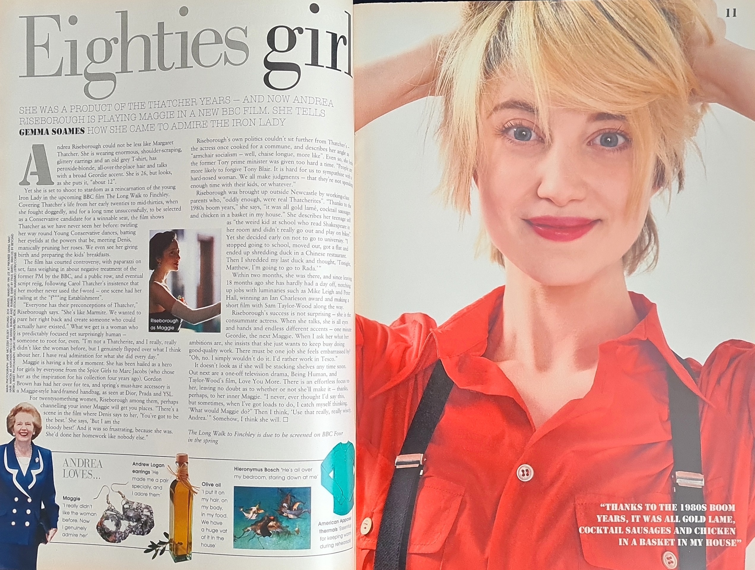 EIGHTIES GIRL – Shoulder pads steely determination, a bit of blue language -the actress Andrea Riseborough is set to redefine Maggie Thatcher in a forthcoming BBC drama. She tells Gemma Soames why the ultimate power woman is secretly a heroine for many